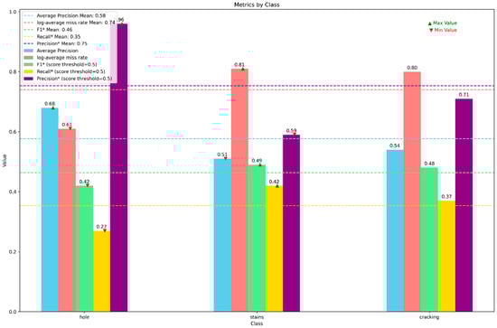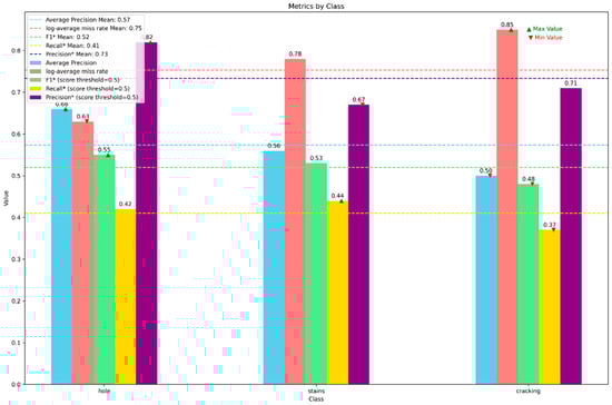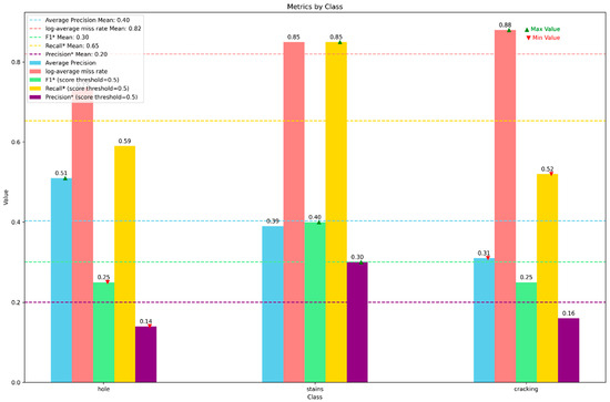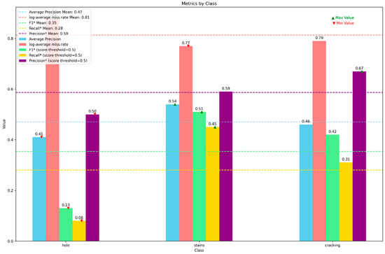 - For the hole label, the average precision is 0.51, which means that among all hole detections, the correct detection rate is more than half, but it is not high. At the same time, the log-average miss rate is 0.73, indicating that the model has a serious problem of missing holes when detecting holes. The F1 value is 0.25, which is a low comprehensive indicator, indicating that the model performs poorly in balancing precision and recall rate. Specifically, the recall rate is 0.59, indicating that the model can detect about 59% of the holes, but its precision is only 0.14, which means that in regard to the number of holes detected, only 14% are real holes, indicating a high false-positive rate.