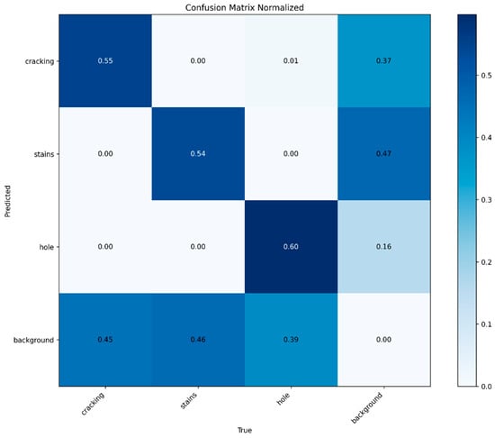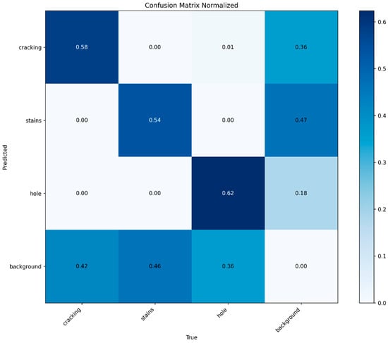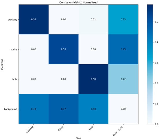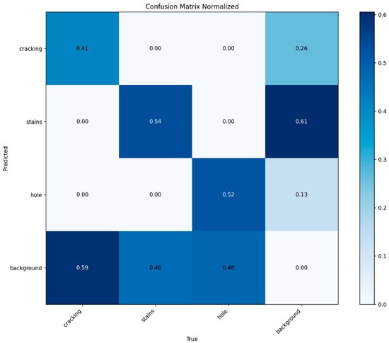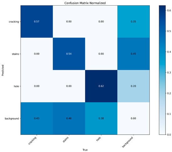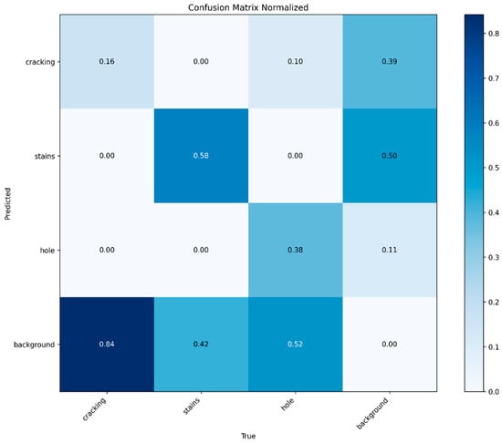 (6) Results analysis stage: The objective of the model-testing phase was to conduct a thorough evaluation of its performance and pinpoint areas that may require further refinement. At the macro level, this analysis consolidates and examines the overall effectiveness of the model across the full test dataset, focusing particularly on its robustness and precision in the detection and localization of various types of damage. At the micro level, the focus is on how well the model can identify certain types of damage. This was determined by testing its performance in a variety of damage detection situations and examining things like detection rates, sensitivity, and any possible biases toward certain types of damage or conditions. By conducting a detailed examination of the model’s operational behavior under and in various conditions and environments, respectively, this study highlights the challenges that the model might encounter in real-world applications and proposes strategies for its optimization. Additionally, this research explores instances of suboptimal model performance, investigating potential causes such as data imbalances and insufficient feature differentiation. These insights are crucial for guiding the further enhancement and fine-tuning of the model.