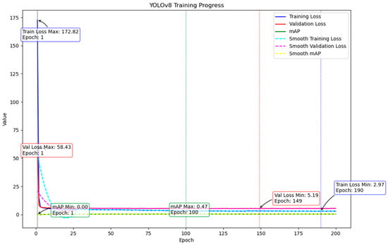 (5) Model testing stage: We conducted multiple tests on the model after training it to evaluate its performance and practical application effects. During the training process, the model generated a variety of loss values, including validation loss and training loss. These indicators help us to understand the performance of the model at different stages. To simplify the evaluation process, we used a simple mean average precision (mAP) calculation tool to track the mAP value during training so as to evaluate the detection accuracy of the model in real time during training. By analyzing the various loss values and mAP values during the training process, we selected the models with the best numerical performance and the last generation of models for further testing, constituting a total of four models. We selected these models because they demonstrated high stability and accuracy during the training process, and we anticipated they would exhibit strong performance in actual tests.