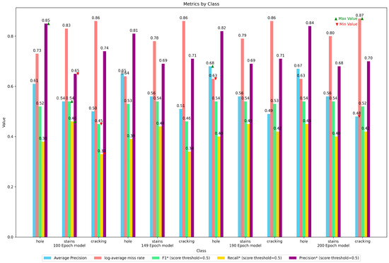 We used an initial baseline setting in the first experiment. We set the model parameters and dataset-partitioning values to the default settings to allow them to serve as comparison benchmarks for subsequent experiments. The primary goal for this experiment was to build a basic model and determine the direction of improvement through preliminary result analysis. A look at important numbers like average precision, log-average miss rate, F1, recall, and precision (as shown in Figure 12) shows how we were able to determine how well the model could find different kinds of damage.