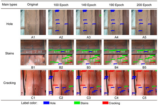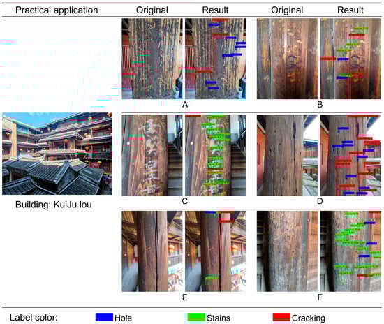 During the model-testing phase, we used two key indicators, mAP (mean average precision) and lamr (log-average miss rate), to evaluate the numerical performance of the model. mAP is a performance indicator widely used in target detection tasks. It assesses a model’s overall detection ability by calculating the average precision across all detection categories. A higher mAP value indicates that a model performs well in multiple detection categories. Lamr measures a model’s detection performance by calculating the average error rate, particularly in high-false-positive cases. A lower lamr value indicates that a model has a lower error rate and higher reliability in the detection task. In addition to numerical tests, we also conducted actual image detection tasks to intuitively judge the effectiveness of the model. In this stage, the model detected wood structure damage (stains, cracks, and holes) in multiple test images. By observing the model’s detection results, in this experiment, we were able to intuitively understand the model’s performance in actual applications, including its recognition accuracy and detection speed for different types of damage. Finally, we selected the most suitable model for this study based on the models’ performance regarding the above test indicators and their effectiveness in the detection tasks. We used this model for subsequent analysis and applications, such as the real-time monitoring of damage to wooden structures in Fujian Tulou and the formulation of maintenance recommendations.
