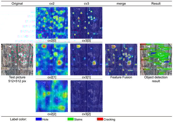 Overall, the YOLOv8 model used in this study does a good job of turning the input image into target detection results using the backbone network, the neck network, and the head network. The backbone network can extract information from multi-scale features to ensure comprehensive coverage of targets of different sizes. The neck network can perform multiple feature fusion and upsampling operations, enhancing the model’s multi-scale feature expression ability. The head network can make predictions at multiple scales, ensuring the accurate detection of targets of varying sizes. The design of these architectures is suitable for detecting damage (stains, cracks, and holes) to wooden structures in Fujian Tulou. Through multi-scale feature extraction and fusion strategies, the model can efficiently and accurately identify damage of different types and scales, providing strong technical support for the protection and restoration of Fujian Tulou.