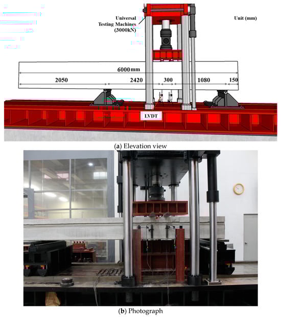 The specimen testing was conducted using a four-point bending test configured as a simply supported beam. This was performed with a universal testing machine (U.T.M) with a capacity of 3000 kN, as illustrated in Figure 5a. The load was applied continuously at a rate of 0.05 mm/s using the displacement control method. For the bending performance evaluation, the test continued until the load decreased after reaching its maximum shear strength. The specimen’s deflection under the applied force was recorded by placing two LVDTs at the bottom of the central section between the load application points, where the maximum deformation occurred, as shown in Figure 5b.