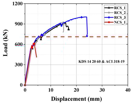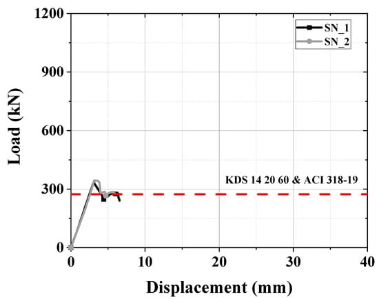 The load–displacement relationships of the PS-HCS specimens are shown in Figure 6 and Figure 7. The load for each specimen was measured using a load cell attached to the UTM; the deflection was measured using the displacement of an LVDT installed at the bottom center of the specimen. All specimens exhibited linear load-deflection behavior until the initial bending crack occurred. For the SN and NCS specimens without shear reinforcement, linear behavior was observed as the shear force increased after the bending crack occurred. However, after reaching the maximum strength, a diagonal shear crack appeared, causing a rapid decrease in strength. For the RCS specimens with shear reinforcement, the bending stiffness decreased as the shear force increased after the occurrence of bending cracks, similar to the SN and NCS specimens. However, the load was transferred to the shear reinforcement due to the diagonal shear cracks, resulting in a stable increase in load without a sharp decrease in strength. Eventually, the diagonal shear cracks widened significantly, leading to final failure with a decrease in strength.
