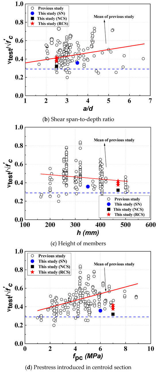 As mentioned in Section 2, the shear performance of HCS is determined by the web shear cracking concrete shear strength rather than the bending shear cracking concrete shear strength due to the introduction of prestress and the hollowing effect in the web, which has a relatively weak structure. To objectively evaluate this, the main influencing factors were analyzed using the experimental results of previous researchers [6,14,15,16,17,18,19]. For comparison, 170 experimental data points were collected; these are summarized in Table 4. Figure 9 provides a comparison between the results of previous studies and the experimental results of HCS, with the shear strength normalized (νtest/fc′) for objective comparison of each major influence factor. Figure 9a,b illustrates the trend of the concrete compressive strength and the shear span ratio, indicating an increasing trend with a consistent slope as both factors increase. Figure 9c, which shows the concrete compressive stress while considering the stress loss of prestress at the center of the cross-section, reveals a significant increase in the concrete compressive stress compared to other variables, confirming the major impact of this variable on the web shear zone concrete shear strength. Figure 9d shows that, for member height, both HCS experimental results and previous studies exhibit a similar decreasing trend compared to other variables. However, when compared to the shear strength required for web shear zone concrete (0.29fc) in the standards, previous studies displayed a consistent trend, confirming that the size effect did not appear in HCS members, similar to the findings of Palmer and Schultz [25].