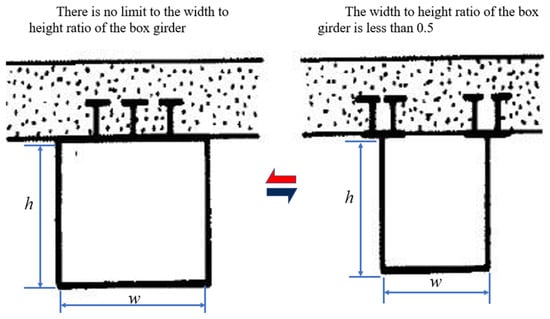 Composite system that integrates the strengths of both steel and concrete structures []. Steel–concrete composite structures offer the advantage of reducing the amount of steel required for construction compared to conventional steel structures []. They enhance structural stiffness, durability, stability, and fire and shock resistance []. This approach utilizes steel beam-laminated concrete bridge panels to maximize the exceptional tensile properties of steel and the favorable compressive properties of concrete. Amidst the ongoing evolution of various steel–concrete composite beams, a novel structure has arisen: narrow steel box–concrete composite beams, depicted in Figure 1. Its main features are that the main bearing steel beam is designed into a narrow box shape, the width of the box does not exceed 1/2 of its height, and the box is connected by a beam and then superimposed to a concrete bridge panel. Figure 1 briefly illustrates the difference between the narrow steel box girder structure and the ordinary steel box structure. In the follow-up study on the influence of the width/height ratio of the box girder on the performance of the composite beam bridge, it is necessary to reduce the thickness and ensure that the filling amount of concrete is equal.