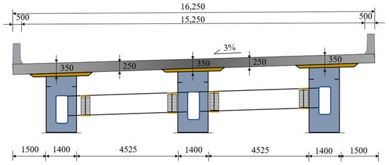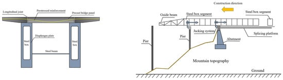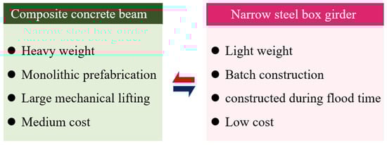 Compared to other bridge types, narrow steel box–concrete composite bridges offer advantages such as reduced construction costs, low construction complexity, and shorter construction durations, as shown in Figure 2. This type of bridge is particularly well-suited for environmental conditions, such as mountainous terrains, where traditional construction methods may be challenging. Additionally, it holds the potential for widespread adoption and applications in the reconstruction of highways that have been severely impacted by earthquake disasters. Steel–concrete composite beam bridges offer unique advantages in mountain road construction, particularly in the aftermath of disrupted traffic conditions following an earthquake: (1) Compared to concrete structure bridges, the weight of the bridge span is significantly reduced. The steel beams utilize a separate body combination method, resulting in lightweight unit components that facilitate factory prefabrication and transportation in mountainous regions. (2) The bridge can be rapidly erected and constructed without the need for large lifting equipment. During construction, workers do not have to work in the steep gullies and riverbeds that are common in mountainous regions, leading to significant savings in support materials and labor []. The prefabrication of steel box girders and bridge panels can proceed concurrently with the construction of the substructure without being constrained by time or location. (3) Once the bridge pier is constructed, the installation and construction of the bridge span can proceed as usual, even during periods of flooding []. (4) The steel–concrete composite beam bridge makes full use of the advantages of steel and concrete, and through reasonable structural design, it can minimize the use of materials while ensuring the strength and bearing capacity, thus reducing the material cost. Compared to the traditional pure steel bridge or pure concrete bridge, the construction period of the steel–concrete composite beam bridge is relatively short. Due to the use of prefabricated components and the process of on-site assembly, the construction period can be greatly shortened, the usage time of labor and equipment can be reduced, and the construction cost can be reduced. Thanks to the aforementioned advantages of narrow-width steel box girders, they have increasingly been utilized in the rapid reconstruction efforts following earthquakes and in construction projects undertaken in challenging geographical environments, particularly in mountainous areas. The spacing between the two main I-beams of the Hospital Bridge [] completed in France in 1990 is 12.6 m, indicating that the spacing between steel boxes can further expand the application range of the double-narrow steel box. The simple configuration of double main beams is clearly desired in both the design and construction phases. Structural analysis revealed that the structural system of a double main beam bridge, featuring a steel main beam roof with large-section stiffness and a concrete bridge panel, forms a composite structure.
