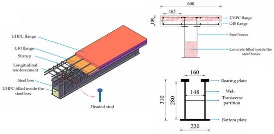 The introduction of narrow-width steel box girders offers a new structural option for concrete composite beam bridge systems. However, there is ongoing development in the design improvement of narrow-width steel box girders. Within the composite continuous beam system, the negative bending moment tends to concentrate close to the cross-section of the central support [] and the conventional steel–concrete composite section of the concrete wing exhibits signs of separation and fracturing []. It fails to effectively fulfill its role in withstanding external forces, with the steel beam predominantly situated within the compression zone of the section, leading to overall stability concerns. Consequently, a densely packed narrow steel box–concrete composite continuous beam, illustrated in Figure 3, is proposed. This configuration typically comprises reinforced concrete wing plates, narrow steel boxes partially filled with concrete, and shear connectors facilitating shear force transmission. The densely packed narrow steel box–concrete composite continuous beam constitutes the interconnection of the concrete wing plate and the concrete-filled steel box beam via shear connectors []; given that the steel box adjacent to the side support, middle support, and negative moment region experiences significant shear forces, it may be infused with concrete to augment the coaction between the steel box and enhance the flexural and shear strength within this segment. The concrete wing slab in the negative moment zone of the densely packed narrow steel box and the concrete composite continuous beam are subjected to tensile forces. In the case of the NC (ordinary concrete) wing slab in the negative moment zone, it is suboptimal to postpone the initiation of initial cracking [], while the concrete wing slab of the composite beam retains an ideal reserve of strength and stiffness after cracking; it is imperative to mitigate the accelerated corrosion of steel bars following cracking []. Minimizing crack propagation in the negative moment zone during normal usage is imperative. Moreover, the swift advancement of research on ultra-high-performance concrete (UHPC) has captivated the interest of numerous scholars owing to its exceptional mechanical properties. Mo [] pioneered the utilization of UHPC wing plates, replacing conventional NC (ordinary concrete) wing plates, in the negative moment region of composite beams. This innovative approach effectively addressed the issue of cracking observed in narrow steel box girder wing plate concrete.