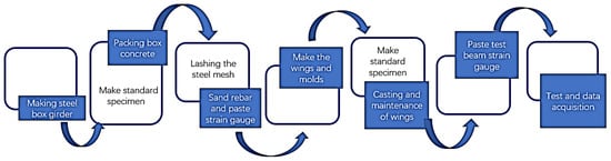 The narrow-width steel box–UHPC composite beam primarily consists of a concrete wing plate and a steel box beam, connected through shear connectors and filled with ultra-high-performance concrete (UHPC) []. The production process of the narrow-width steel box–UHPC composite beam (NSBCB) structure entails several stages, including steel box fabrication, concrete filling within the box, steel mesh binding, wing mold preparation, and wing plate casting [], as shown in Figure 4.