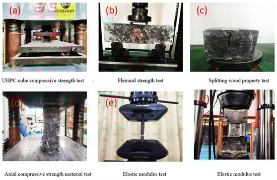 After filling the box with concrete, a vibrator ensures uniform vibration of the core concrete. The steel box is then positioned horizontally for curing. To ensure the strength of the wing panels [], material mixtures were strictly controlled to use the same batch of concrete. The concrete was quickly transported to the pouring platform and uniformly poured from the middle to both ends of the span. Delays in concrete preparation can cause bonding issues, reducing wing slab strength []. After 28 days of curing at room temperature, all specimens underwent tests for compressive strength, flexural strength, and splitting strength, as shown in Figure 5.