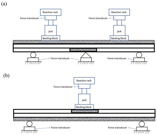 A slip meter measures slip at the wing plate and steel box beam interface. Strain gauges measure strain distribution at various locations on the test beam. The locations include the mid-span steel box girder’s web, the steel beam’s web along its height, the main rib of the wing plate, the top surface of the wing span, and the mid-side of the span. A displacement meter is installed at the loading point and support position to generate the load–deflection curve []. Strain data are collected using a strain-collecting instrument, while displacement measurements are obtained manually. The crack distribution of the wing plate is monitored with a crack observation instrument during the test loading. Two common loading methods are used: three-point bending and four-point bending as shown in Figure 6. The four-point bending test (4PBT) is commonly used to assess shear behavior in the positive moment region, while the three-point bending method is typically used for shear tests on continuous beam bridges in practical engineering. However, some studies use the four-point bending method to comprehensively analyze the combined action of composite beam bridges [].