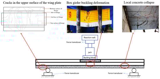 Steel–UHPC beams can fail in different ways based on loads, materials, and geometry. Maximum shear capacity is achieved when the wing plate and steel box fail simultaneously. Practical applications may experience overall failure due to single or multiple local failures. The literature review indicates that under negative bending moments, the failure of narrow-width steel box girder–UHPC composite beams is characterized by buckling deformation, cracks on the upper wing plate, and localized concrete crushing. The typical failure modes of narrow-width steel box girder–UHPC composite beams are summarized in Table 1. Mo et al. [] reported that flexural shear failure occurred mainly due to shear action, and the mid-span of the wing plate was cracked by bending action. Due to the action of pegging, the lateral cracks on the wing plate developed slowly and appeared as steps between the UHPC–NC layers. The cracks in the upper part of the wing plate developed approximately equidistant from the stud spacing, which was due to the stress concentration caused by the local strengthening of the stud in the inner section of the wing plate. Shear oblique cracks appeared on the side of the wing plate at the support, accompanied by the slip between the UHPC–NC wings. The steel beam buckled at the loading point and the middle partition. Liu et al. [] reported that the main fracture across the flange was observed on the fragile surface located at the midpoint of the test beam, and the final failure mechanism observed in the six test beams was remarkably similar. When the steel wire in UHPC was extracted, the delamination between the flange and the steel bar was observed at the crack location. Due to the relative displacement, longitudinal cracks and delamination appeared between the UHPC layer and the C40 layer of the flange, and diagonal cracks appeared on the side of the flange. In general, the test beams exhibited typical tensile fracture characteristics, such as local buckling and observable shear deformation in the lower part of the steel box girder. Xiong et al. [] reported that filling concrete inside the steel box of UHPC composite beams can significantly improve the shear resistance of the specimens. When the steel box was not filled with concrete, the bending deformation of the box beams resulted in brittle failure of the test beams, while the other test beams had similar mechanical characteristics, resulting in bending and shear failure mainly caused by shear action; the wing plates were cracked by bending action in the middle span. According to the literature review, the main failure of the UHPC composite beam under the condition of negative moment zone is buckling deformation of the box girder, surface crack of the wing plate, and local concrete crushing, as shown in Figure 7.