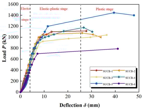 Simultaneously, through a literature review of load–span deflection [,,,,,,,,,,,,,,], we can roughly categorize the deflection curve into three stages.