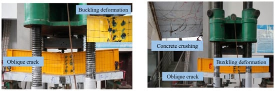Upon reaching the ultimate load, the test beam transitions into the failure stage. As the deflection of the test beam increases, the load diminishes to some extent, accompanied by the widening of the main crack. Subsequently, the steel box web plate exhibits baroclinic buckling, while the bottom plate of the steel beam bulges at the point of the concentrated force application. This leads to a sharp increase in deflection and a rapid reduction in the bearing capacity due to shear failure. Figure 8 illustrates the load–mid-span deflection curves of six specimen beams under various parameter conditions as reported by Liu et al. It is observed that upon entering the plastic stage, the stiffness of the UHPC composite beam notably decreases, with cracks appearing on the upper surface of the wing plate upon further loading (Figure 9). After entering the failure stage, the steel beam experiences partial buckling deformation (Figure 9), eventually rendering it incapable of fulfilling its intended function.