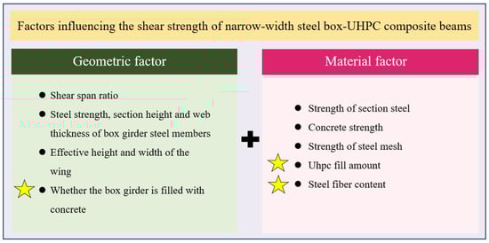 Similar to the traditional steel–concrete composite beam bridge structure, the factors affecting the shear resistance of narrow-width steel box–UHPC composite beams can be divided into geometric factors and material factors. Among them, a considerable number of the factors are the same as the narrow steel box girder and the concrete composite beam bridge (as shown in Figure 10), such as the shear span ratio, the strength of concrete and steel materials, and so on. Therefore, in this section, we focus on the unique factors affecting the shear strength of narrow-width steel box–UHPC composite beams (shown by the star in Figure 10).