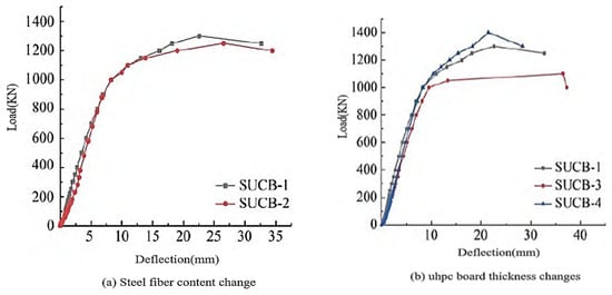 When the steel fiber content of UHPC changes [], the steel fiber content increases from 0 to 2%, and the ultimate loads of the composite beams are 1300 and 1250 kN, respectively, with a difference of only 4%, as shown in Figure 11a. The steel fiber content has little effect on the bearing capacity of the composite beams. However, during the crack development of the specimen, it can be observed that the crack development speed of the test beam decreases after the addition of steel fibers. When the maximum crack width is 0.2 mm, the loads of the specimens SUCB-1 (steel fiber content of 2%) and SUCB-2 (without steel fiber addition) are 500 and 330 kN, respectively. Adding steel fibers can effectively improve the cracking resistance of composite beams.