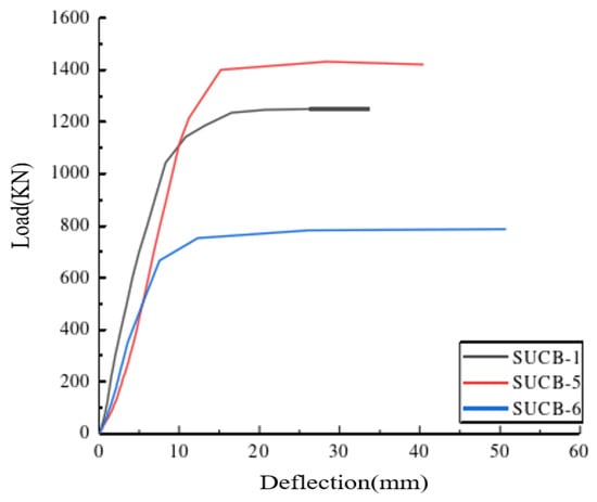 As the composite beam is subjected to shear action mainly under the action of the negative bending moment, the concrete wing slab of the composite beam will suffer shear failure. According to the test results, when the other parameters remain unchanged and the thickness of the UHPC wing slab changes, compared to SUCB-3, the bearing capacity of SUCB-1 and SUCB-4 increased by 18.2% and 27.3% respectively, and the deformation capacity increased by 38.02% and 41.2% respectively, as shown in Figure 11b. The increase in the thickness of UHPC fins can effectively improve the mechanical properties of composite beam fins and significantly enhance the shear-bearing capacity and deformation resistance of composite beams [].