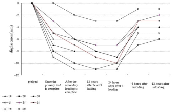 A linear relationship exists between the stage load and deflection, and the steel beam remains unyielding. However, under the negative bending moment, a few cracks emerged, and the composite beam wing showed some plastic deformation.