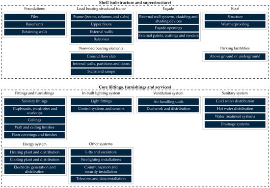 Following this, only items classified as 1 passed through the second phase. As the WLC assessment aims to obtain as complete a picture of the building as possible, the building was divided into building parts, as the Level(s) framework suggests, such as foundations, external walls, façade openings, etc., as described in Section 2.2.