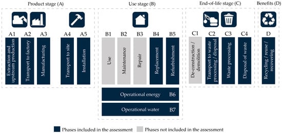 In this study, the LCA is performed considering the “cradle-to-cradle” approach according to the stages highlighted in Figure 3, namely product and construction process (A), use stage (B), end of life (C), and benefits (D).
