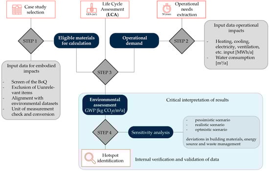 The reference study period (i.e., 50 years) alters the replacement of construction products used in the building (B4 phase). Construction products with a service life shorter than the reference study period must be replaced one or more times during the reference study period. In the case of this specific work, the service life for the individual building parts is based on the dataset (either EPD or generic dataset) from OCLCA; the default value is given by the software being used. The description of how a case study is assessed can be graphically illustrated by four main steps, as Figure 4 shows.