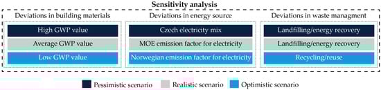 Considering the first option, since the primary approach of this study aimed to consider the most impactful datasets in terms of GWP, and to account for the “worst-case scenario” possible, a sensitivity analysis can be conducted to provide results for realistic and optimistic scenarios. Following the completion of the LCA, this analysis involves transitioning from the most impactful materials (e.g., concrete datasets, rebar datasets, etc.) to the most environmentally friendly ones in terms of GWP. Notably, the internal database outlined in Section 2.2 was updated with two additional datasets per item, focusing only on the most frequently occurring materials/products identified through environmental assessment (i.e., the so-called hotspots). This update facilitated an understanding of potential improvements if the most impactful material datasets of each case study were altered, prioritizing Czech datasets initially and, if not available, datasets from neighboring countries with similar energy mixes for materials production.