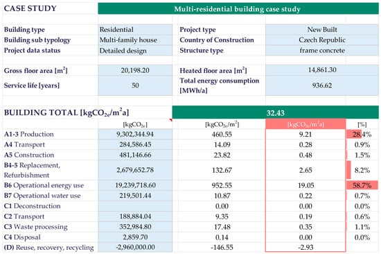 In the Czech Republic, only a very limited national environmental database with specific LCA data is available, the so-called CENIA database [], based on the Environmental Product Declaration (EPD); this database contains slightly more than 200 datasets, which do not cover all the product groups needed for the whole building WLC assessment. Therefore, it was necessary to establish a unified internal database, based on available data, to assess all the case study calculations.