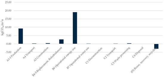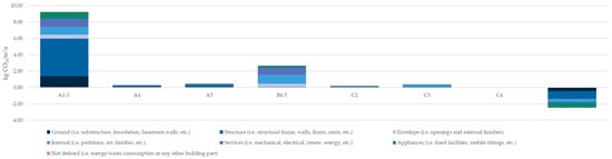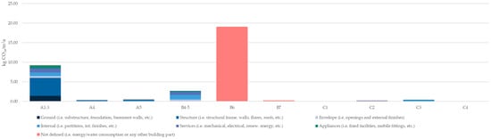 The substages (A1–A3) are characterized by embodied impacts due to the extraction and manufacturing of raw materials. The sub-stage (A4) refers to the impacts related to the transportation of building materials from the production site to the construction site. Sub-stage (A5) includes emissions and energy used for installation. (B4 and B5) refer to the replacement and refurbishment of building components. (B6) mostly refers to operational energy, which is considered the primary part of the total energy used in buildings for cooling, heating, ventilation, lighting, and heating water. (B6) therefore requires operational energy. (B7) covers operational water consumption. Substages (C2) and (C3) consider the transport and process of the waste, while (C4) includes the disposal impacts. Stage (D) considers the positive impacts on the environment of certain materials when reused/recycled or from energy recovery. For reasons of necessary simplification and because some life cycle phases are known to have minimal impacts relative to the whole, phases B1-B3 and C1 have been omitted [,]. The specifics of the LCA are listed in Table 1.