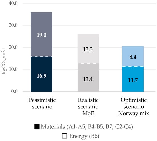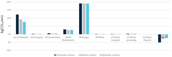 The second option involves choosing a dynamic emission factor (EF) of the electricity mix for the operational stage of the building. In the pessimistic scenario, the B6 value was calculated based on the standard Czech electricity mix used for energy calculations, with an EF according to Decree No. 480/2012 [] of 0.78 kg CO2 e/kWh. In contrast, for the recently published realistic scenario, the EF for electricity by the Czech Ministry of Environment (MoE) was used, which was equal to 0.37 kg CO2 e/kWh []. Lastly, in the optimistic scenario, the emission factor from Norway was adopted as a possible future prospect or the use of renewable sources directly in buildings, primarily due to its reliance on renewable sources, which equals 0.0241 kg CO2 e/kWh.