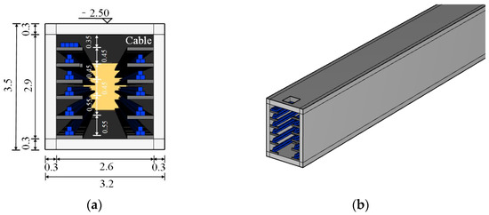 This study investigates a rectangular cross-section of a comprehensive pipe gallery’s cable compartment, employing FDS software to analyse smoke flow characteristics in fire scenarios. Its main structure is made of reinforced concrete with a burial depth of 2.5 m, area dimensions of 3.2 m × 3.5 m × 200 m, and the wall plate of the pipe gallery is made of 0.3 m thick concrete. Additionally, there are a 0.3 m air inlet and outlet sections located 0.9 m × 0.9 m from the closed section of the pipe gallery configuration. The cables are arranged in layers on both sides of the cable rack, as depicted in Figure 1.