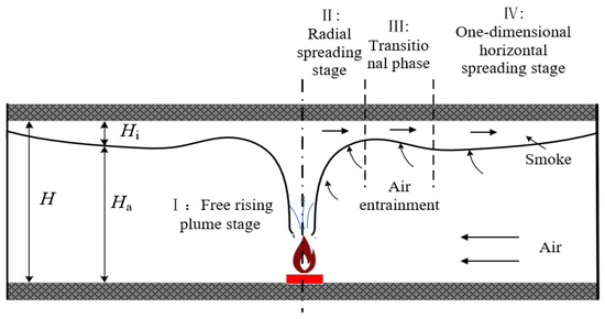 The height and thickness of the smoke layer are important parameters that characterize the structural features of the smoke layer in a fire scenario. Figure 5 shows the smoke structure characteristics in the comprehensive pipe gallery fire scenario, primarily divided into four stages: free-rising plume, radial spread, transition, and one-dimensional horizontal spread [17].
