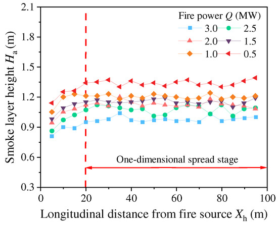 The smoke layer height () is defined as the distance from the bottom of the pipe gallery to the interface of the smoke layer. Taking the centre of the fire source as an example, Figure 6 shows the smoke layer height varies with the longitudinal distance from the fire source under different fire source powers. From the figure, the smoke layer height decreases as the fire source power increases, with heights of 1.34, 1.12, and 0.98 m corresponding to fire source powers of 0.5, 2.0, and 3.0 MW, respectively. Additionally, when the longitudinal distance from the fire source () is less than 20 m, the smoke layer height increases with increasing distance from the fire source. However, when Xh exceeds 20 m, the smoke layer height no longer changes significantly with distance. At this time, the smoke layer height corresponding to fire source powers of 0.5, 1.0, 1.5, 2.0, 2.5, and 3.0 MW is stable around 1.34, 1.20, 1.15, 1.13, 1.07, and 0.97 m, respectively.