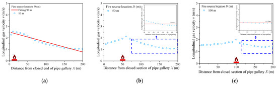 Longitudinal flow velocity when the fire source power is 3 MW: (a) D = 10 m, (b) D = 50 m, and (c) D = 100 m.
