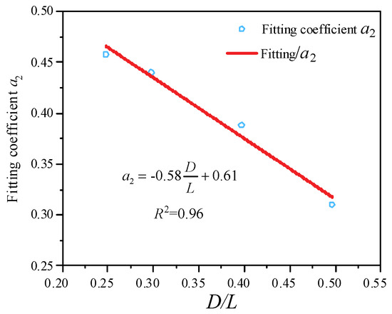 The variation in the fitting coefficient with fire source location is minimal, with an average value of 1.99. However, varies greatly with the location of the fire source. Figure 11 shows the relationship between the fitting coefficient and the dimensionless fire source location (D/L). From the figure, decreases with increasing D/L, as shown in Equation (12) and the fitting coefficient is 0.96.