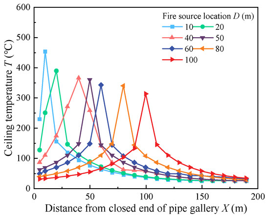 Longitudinal temperature distribution under the ceiling of the integrated pipe gallery: (a) D = 10 m, (b) D = 50 m, and (c) D = 100 m.