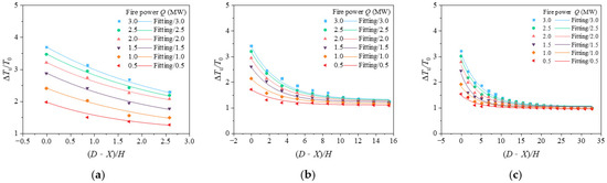 The temperature rise of each measurement point downstream of the fire source and the distance of the measurement point from the centre of the fire source are processed dimensionlessly, and the relationship curves of and (X − D)/H are shown in Figure 20. From the figure, it can be seen that decreases with the increase in (X − D)/H, and an exponential fit in the form of Equation (14) is carried out, and the fitting results are summarised in Table 6.
