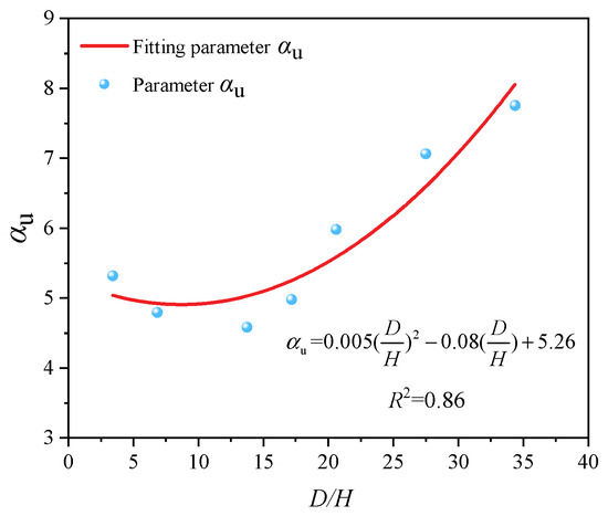 From Table 5, it can be seen that varies less with the position of the fire source and tends to be constant, so its average value of 0.74 is taken. However, varies greatly with the position of the fire source, so the relationship curve of with D/H is drawn, as shown in Figure 18. From the figure, it can be seen that decreases, and then, increases with the change in D/H, and by fitting it, it is found that the quadratic function has a good agreement. The specific expression is as follows: