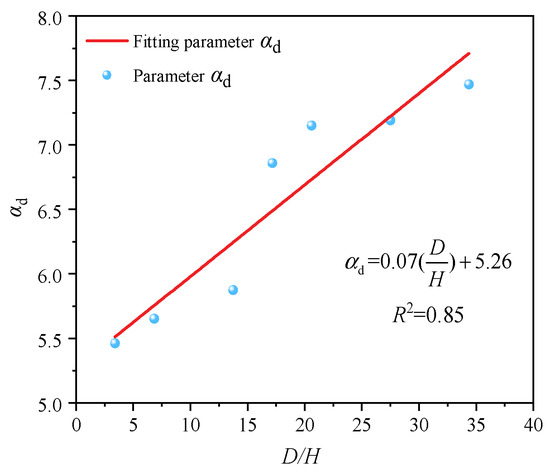 From Table 7, the distance of the fire source centre from the closed end of the pipe gallery (D) has a small effect on the fitting parameter , so its average value of 0.70 is taken, while αd increases with the increase in D. Figure 23 shows the relationship curve between the fitting coefficient and D/H, and the relationship expression between and D/H is obtained by linear fitting, as shown in (20), which is different and higher than compared to the fitting parameter upstream of the fire source.