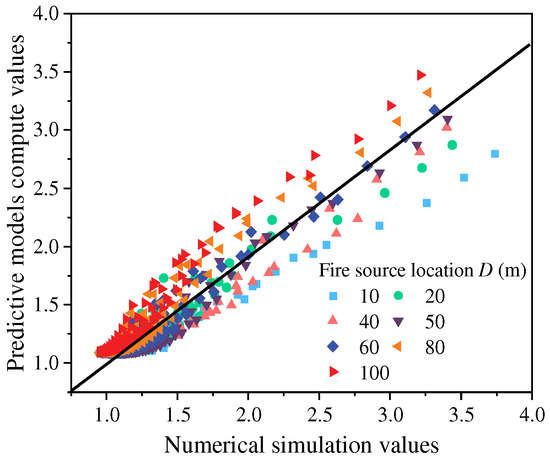 In order to verify the reliability of the above model, the value obtained from Equation (19) is compared with the numerical simulation value, as shown in Figure 19. From the figure, the average relative error in the agreement between its predicted and numerically simulated values is 11.688%. Therefore, the model can be used to predict the longitudinal temperature rise in the upstream region of the fire source of the comprehensive pipe gallery.