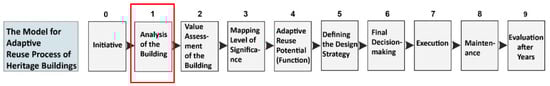 Process model for the adaptive reuse of heritage buildings and the focus of the current research on Step 1 (Analysis), adapted from Arfa et al. [,].