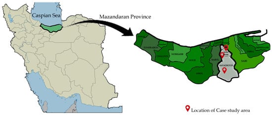 The selected villages are situated in the eastern part of Mazandaran Province (see Figure 5), encompassing the cities of Qaemshahr, North Savadkouh, and Central Savadkouh. This region is bordered to the south by the Alborz mountains and to the north by coastal towns. Savadkouh is positioned in the central part of Mazandaran, on the northern slope of the central Alborz mountains, within a latitude of 35°49″ to 36°23″ northern hemisphere and longitude of 52°39″ to 53°14″ eastern hemisphere.