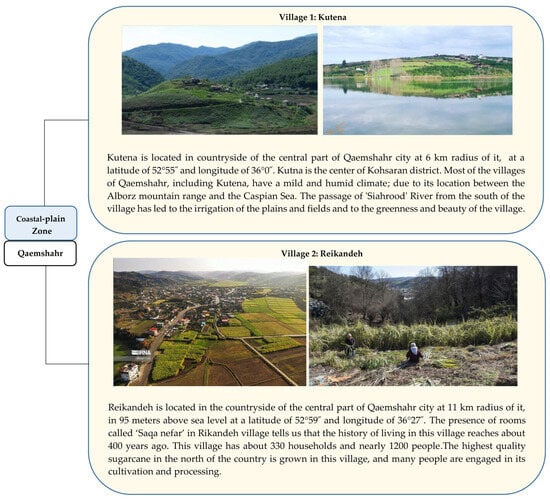 The selected villages include Kutena and Reikandeh, representing the plain zones of Qaemshahr; Naftechal and Bourkhani in Lafour, a rural district representing the foothill zones; and Alasht village in Central Savadkouh, representing the mountainous zones. A summary of some information about these villages is presented in Figure 6.