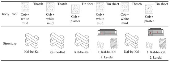 Regarding materials, the mountainous zone structures consisted mostly of cob walls with stone foundations. In the foothill zone, the structure is primarily wooden, either ‘Kal-be-kal’ (timber frame) or a combination of ‘Kal-be-kal’ and ‘Lardei’ (adobe) filled with cob mortar. In the plain zone, cob walls were also common in the historical rural houses. Thatched roofs were common in the plain and foothill historical rural houses, while lath roofs were more prevalent in the mountainous ones, mainly due to the differences in climatic conditions across these three zones.