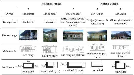 In the villages of Reikandeh and Kutena, five historical houses with diverse typologies were investigated (Figure 9). This area features two types of one-story and two-story houses on platforms. Porch typologies vary, ranging from two- to four-sided, with occasional instances of one-sided porches, where the side or back porches are utilized as Telar. The ratio of openings to the entire wall is approximately 20–40%. Doors are predominantly wooden with double casements, and windows are wooden with double and triple casements.