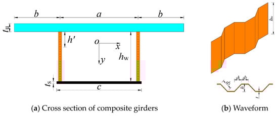 Figure 1a depicts the cross-section of the composite box girder with a corrugated steel web. A coordinate system xOy is established with the centroid of the section as the origin. In this system, tu and ts represent the thickness of the top and bottom plates of the composite beam, respectively, while hw denotes the height of the corrugated steel web. Additionally, a, b, and c refer to the widths of the top plate, cantilever plate, and bottom plate of the composite beam, respectively. represents the longitudinal effective bending height of the corrugated steel web, taking into account the longitudinal constraints of concrete bridge panels. The calculation formula is presented in Equation (2).