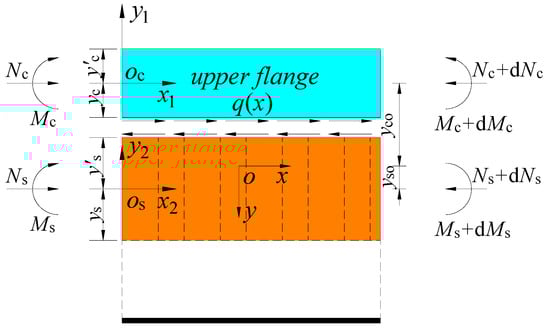 Figure 2 presents a simplified diagram illustrating the temperature-induced force on the composite box girder, while considering the local constraint effect of the corrugated steel web. In the diagram, x1Ocy1 represents a local coordinate system with the centroid of the concrete slab as the origin, while x2Osy2 denotes a local coordinate system with the centroid of the corrugated steel web within the effective bending height range as the origin. The symbol q(x) refers to the shear stress at the interface of the composite beam. Nc and Ns represent the axial forces acting on the concrete slab and steel beam due to temperature, respectively. Similarly, Mc and Ms denote the bending moments experienced by the concrete slab and corrugated steel web due to temperature, respectively. y′c and yc indicate the distances from Oc to both the upper and lower surfaces of the concrete, respectively. On the other hand, ys and y′s represent the distances from Os to both the upper and lower sides of the corrugated steel web within its effective anti-bending range. Additionally, yco is defined as the distance between centroid Oc and centroid O, whereas yso is described as the distance between centroid Os and centroid O.