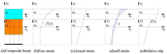 Numerous scholars have extensively researched the calculation methods for temperature-induced stress in traditional steel–concrete composite beams, yielding significant findings. Chen et al. [] derived calculation formulas for the interface shear force and relative slip of traditional steel–concrete composite beams under linear temperature action, considering the coordination of deformation between the concrete and steel beams. Zhou et al. [] developed temperature stress calculation formulas for traditional steel–concrete composite beam bridges based on identical curvature and deformation coordination conditions between the concrete and steel beams, without considering the interface slip. Meanwhile, under conditions involving interface slip, Zhou et al. [] deduced calculation methods for the interface shear, relative slip, and temperature stress of traditional steel–concrete composite beam bridges. Additionally, Liu et al. [] derived analytical expressions for the interface shear force, relative slip, and temperature stress of traditional steel–concrete composite beam bridges with or without interface slip under any temperature gradient action.