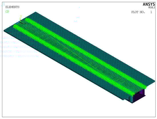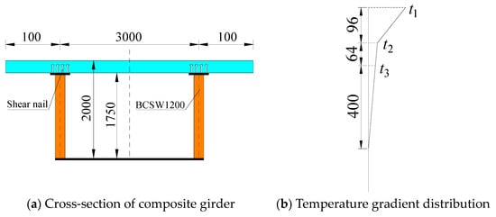 The cross-section of the composite beam is depicted in Figure 5a. The concrete slab is constructed with C55, featuring a thickness of 0.25 m, an elastic modulus of 3.55 × 104 MPa, and a linear expansion coefficient of 1.0 × 105. The corrugated steel web and steel bottom plate are fabricated from Q345 steel, with elastic moduli of 2.1 × 105 MPa and linear expansion coefficients of 1.2 × 105, respectively.