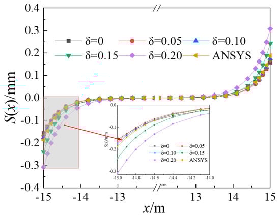 The theoretical calculations presented in this paper closely match the finite element analysis results, as depicted in Figure 7 and Figure 8. The distribution patterns of the interface slip and shear along the composite beam are illustrated: the interface slip follows a hyperbolic sine function distribution, while the interface shear follows a hyperbolic function distribution. At the beam ends (x = ±l), the interface slip reaches its maximum value, whereas it remains at 0 in the middle span. Conversely, interface shear peaks at the middle span (x = l/2) and is 0 at the beam ends. When δ = 0.1, there is a 3.52% difference between the theoretical and finite element values for the interface slip and a 4.84% difference for the interface shear at the middle span.