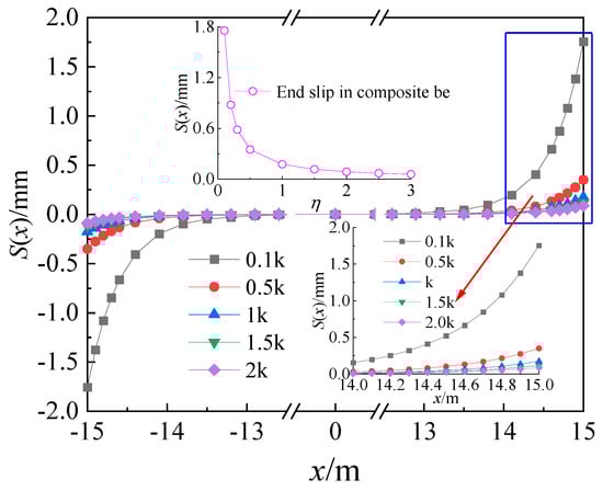 The interface slip stiffness (k) plays a crucial role in determining the longitudinal cooperative force of the composite beam. As indicated by Equation (30), the interlayer slip stiffness does not affect the interface shear force of the composite beam. To investigate the impact of the interface slip stiffness on the interface slip of composite beams, we selected δ = 0.1 and varied the longitudinal slip stiffness to be 0.1 k, 0.5 k, 1 k, 1.5 k, and 2 k, respectively. The results for the interface slip of composite beams are presented in Figure 9. It is evident that there is a negative correlation between the interface slip and slip stiffness: as the interface slip stiffness increases, the interlayer slip decreases, indicating a closer bond between the concrete slab and steel beam with corrugated steel webs.
